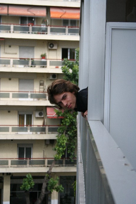 Das ist ein Schlagzeuger auf dem Balkon eines Zimmers eines griechischen Hotels! Bemerkenswerter Anblick, so ein Schlagzeuger in freier Wildbahn!